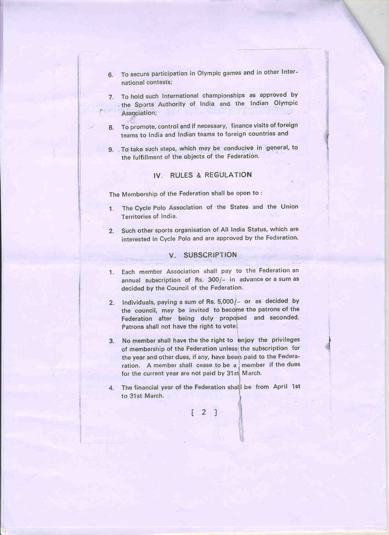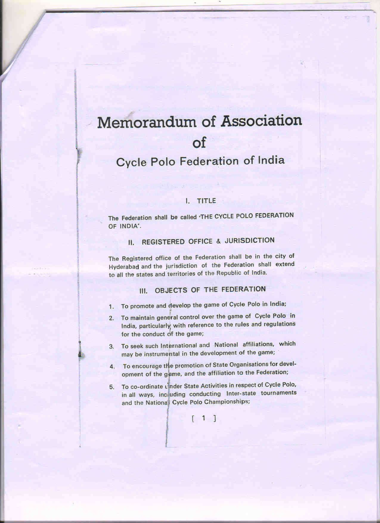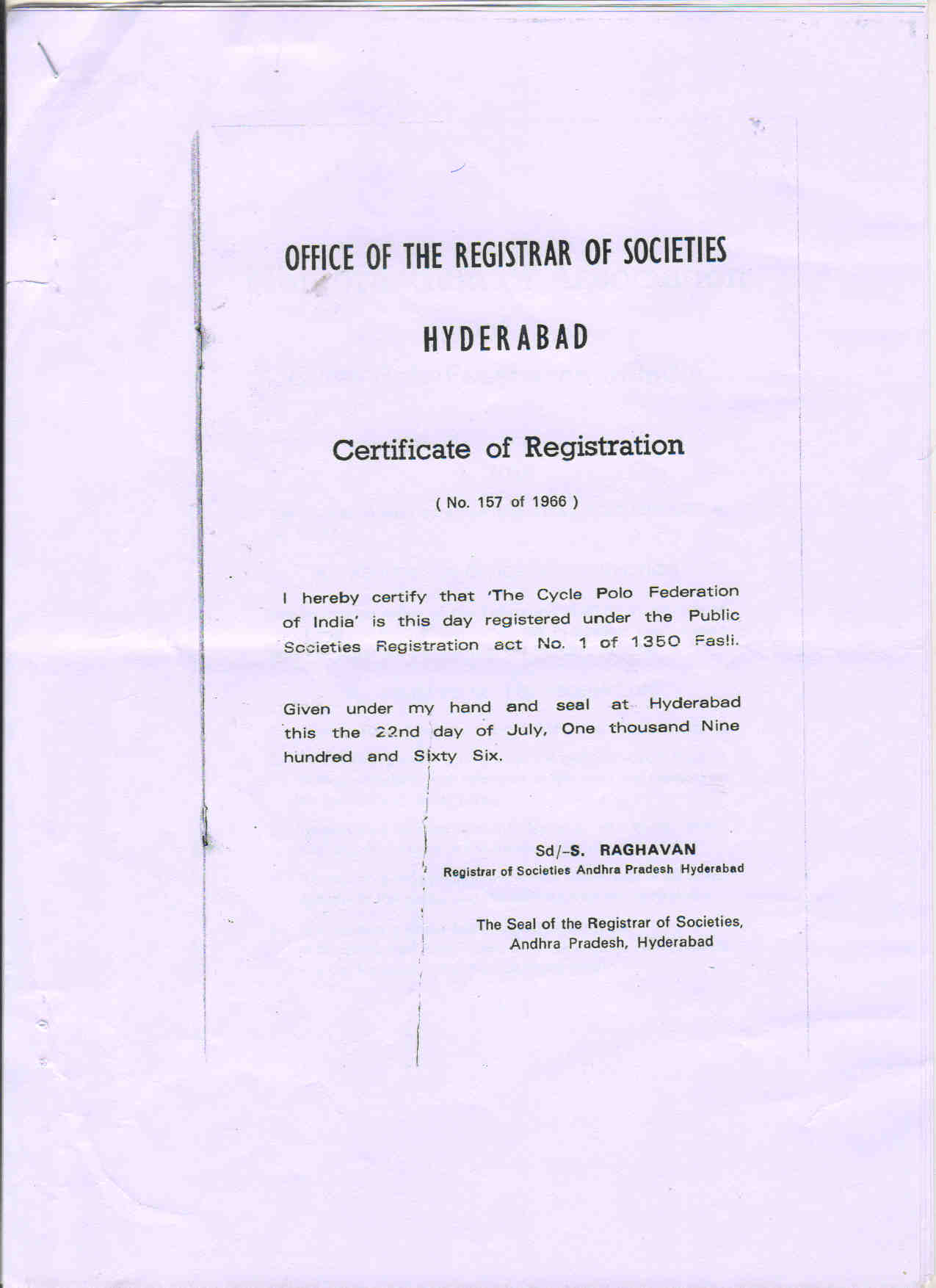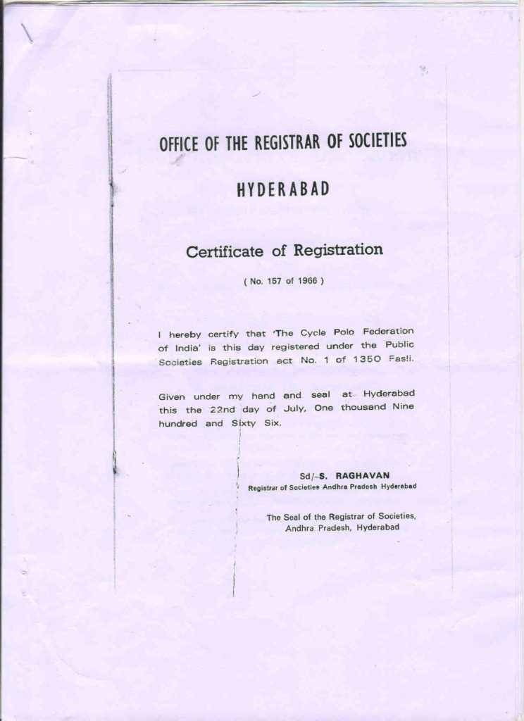 Registration No: 157/1966 Affiliated & Recognized by: ● Ministry of Youth Affairs & Sports ● SAI (Sports Authority of India) ● IBPF (International Bicycle Polo Federation) ● ACPF (Asian Cycle Polo Federation)